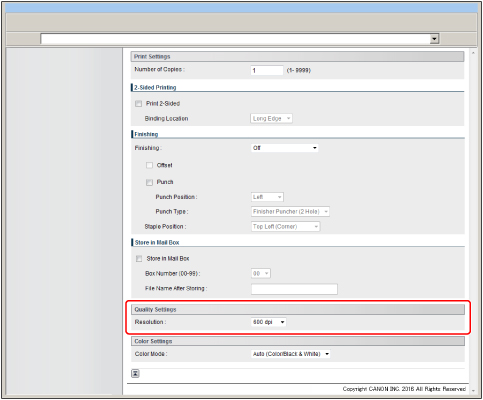 Resolution is expressed in units of dpi (dots per inch), indicating the number of dots in one inch. The higher the value, the greater the resolution, allowing finer expression of detail. If [600 dpi] is selected, you can perform printing suited to general