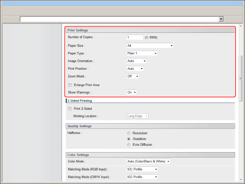 If [Auto] is selected, the image is printed in the specified position of the paper if the print position for the image is specified. If the print position is not specified, the image is printed in the center of the paper.