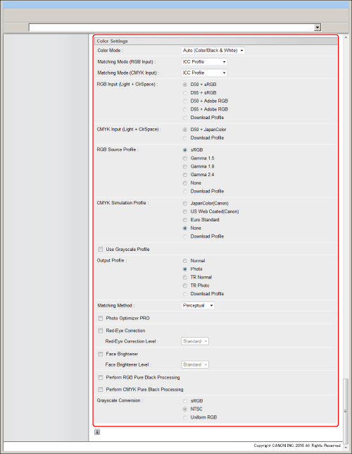 This setting uses custom simulation target that you have downloaded from the host computer to this machine using iW Management Console. You may not be able to use all the profiles that are available. If color data is printed in gray using a downloaded profile, check the downloaded profile for compatibility.
