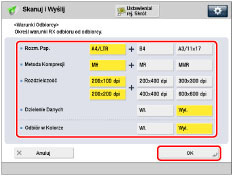 Jeśli odbiorca nie obsługuje odbierania w kolorze, naciśnij [Wyłącz]→ ustaw format papieru, metodę kompresji i rozdzielczość.