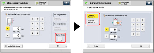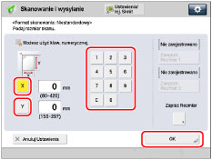 Naciśnij na [X] oraz [Y] → wprowadź format skanowania w mm za pomocą klawiszy numerycznych → naciśnij na [OK].