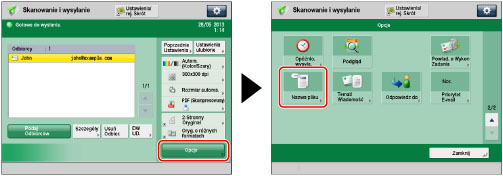 Jeżeli Dzielisz na strony: Prefiks nazwy pliku jest generowany z roku, miesiąca, dnia, godziny, minuty i sekundy jego wysłania oraz pięciu cyfr określających numer strony obrazu. Przykłady: 20160707203000_00002.tif 20160707203000_00002.jpg 20160707203000_00002.pdf 20160707203000_00002.xps Jeżeli nie chcesz dzielić na strony: Nazwa pliku składa się z roku, miesiąca, dnia, godziny, minuty i sekundy jego wysłania. Przykłady: 20160707203000.tif 20160707203000.pdf 20160707203000.xps Istnieje możliwość określenia nazwy pliku za pomocą Zdalnego interfejsu użytkownika w czasie wysyłania na adres e-mail/I-faks lub serwer zapisane w [Ulubione ustawie.].(Patrz "Specifying a File Name for Transmission to a Destination in Favorite Settings.")