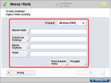 Można zarejestrować informacje o użytkowniku z poziomu  na ekranie podstawowych funkcji [Skanowanie i wysyłanie], ekranie wysyłania [Dostęp do zapisanych plików] oraz ekranie wysyłania [Skrz. Odb. Faks/I-Faks].