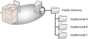 Jeżeli folder domowy zostanie ustawiony na serwerze WebDAV, foldery dla wszystkich użytkowników muszą być przygotowane wcześniej.