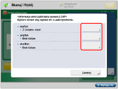 na ekranie podstawowych funkcji [Skanowanie i wysyłanie], ekranie podstawowych funkcji [Faks], ekranie wysyłania [Dostęp do zapisanych plików] oraz ekranie wysyłania [Skrz. Odb. Faks/I-Faks]. |