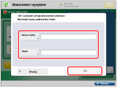 na ekranie podstawowych funkcji [Skanowanie i wysyłanie], ekranie wysyłania [Dostęp do zapisanych plików] oraz ekranie wysyłania [Skrz. Odb. Faks/I-Faks]. |