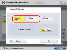 Jeżeli [Raport TX] w [Ustawienia Funkcji] (Ustawienia/Rejestracja) jest ustawione na „Tylko dla błędu” lub „Włącz”, to Raport z TX wysyłania jest drukowany wraz z Raportem TX faksu.