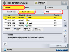W takich sytuacjach zadanie, o którym mowa nie jest uważane za zakończone, nawet jeżeli przesyłanie zostało pomyślnie zakończone.Takie zadania, pojawiają się w formie <Czekaj na rezultat TX...> na ekranie Statusu zadania, aż do upłynięcia czasu ustawionego dla [Odstęp czas. dla trybu pełnej TX] w [Ustawienia E-mail/I-Faks] in [Ustawienia Funkcji].Gdy upłynie zadanie [Odstęp czas. dla trybu pełnej TX] zadanie jest przenoszone do rejestru, a jego wynik wskazywany jest za pomocą myślnika <->. Dzieje się tak, jeżeli wysłania dokumentu do serwera plików lub innego odbiorcy nie można zweryfikować.(Patrz "Limit czasu dla trybu pełnej TX.")