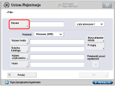 Aby uzyskać więcej informacji na temat poszczególnych ustawień FTP, Windows (SMB) oraz WebDAV, patrz "Określanie serwera plików za pomocą klawiatury."