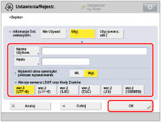 Możesz wybrać jedynie [Użyj (uwierz. zab.)] obok <Informacje dot. uwierzytel.>, jeżeli serwer LDAP pracuje pod systemem Windows Server 2003 z Aktywnym Katalogiem lub Windows Server 2008 z Aktywnym Katalogiem.