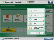 Można określić, czy wyświetlać funkcję faksu na ekranie Menu głównego.Jeżeli chcesz aby funkcje faksu zostały wyświetlone na ekranie Głównego Menu, możesz wybrać czy chcesz wyświetlić funkcje faksu w [Skanowanie i wysyłanie].Poprzez wyświetlenie funkcji faksu w [Skanowanie i wysyłanie], w tym samym czasie można wysyłać do różnych odbiorców używając różnych metod wysyłania, takich jak e-mail i I-fax.