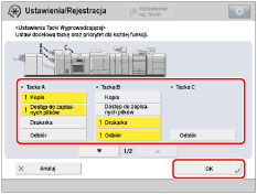Priorytetowa kolejność miejsc wyprowadzania jest określona przez kolejność wybranych tac wyprowadzających.Priorytet jest wyświetlany jako 1 i 2.