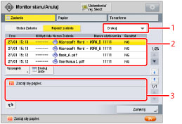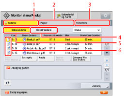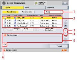zostanie wyświetlony ekran Monitor stanu/anuluj.Z poziomu tego ekranu, możesz zmienić kolejność zadań, anulować zadania i potwierdzić szczegółowe informacje na temat statusu i rejestru zadania.Możesz również uzyskać szczegółowe informacje na temat materiałów eksploatacyjnych.