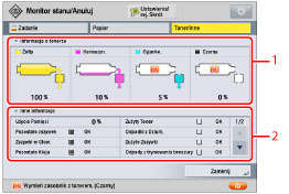 Informacje na temat pozostałej ilości tonera są wyświetlane w górnej części, natomiast inne informacje są wyświetlane w dolnej części ekranu Toner/Inne.