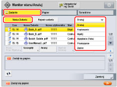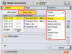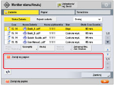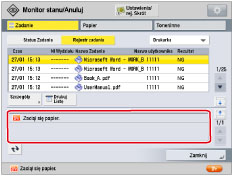 Jeżeli funkcja [Wygasł Czas Wstrzymanego Zadania] w [Ustawienia Funkcji] (Ustawienia/Rejestrowanie) jest włączona, zadanie wstrzymane z powodu braku dostępnego papieru do drukowania wyświetlane jest jako wstrzymane zadanie, po upływie określonego czasu. Aby wznowić wstrzymane zadanie, załaduj papier → wybierz zadanie → naciśnij na [Szczegóły] → [Wznów].