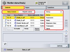 Naciśnij na [Zadanie] → [Status Zadania] lub [Rejestr zadania] → i wybierz rodzaj zadania z rozwijalnej listy.