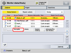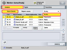 Jeżeli wybierzesz zadanie drukowania i naciśniesz na [Szczegóły], press [Wymuszenie Podawania] aby wymusić druk danych w pamięci; następnie naciśnij na [Pomiń Błąd], aby tymczasowo dezaktywować błędy i kontynuować drukowanie.[Wymuszenie Podawania] oraz [Pomiń Błąd] mogą być wykorzystywane wyłącznie dla zadań drukowania wysłanych z komputera.