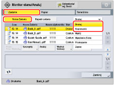 Po wyprowadzeniu wydruku próbnego, urządzenie automatycznie rozpocznie przetwarzanie zadania drukowania.Jeżeli potrzebujesz wykonać regulację ustawień, naciśnij na [Anuluj] lub Zatrzymaj Wsz. Zad. Drukow. i wprowadź niezbędne regulacje.