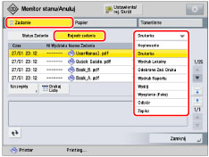 Możesz drukować listy statusu dla zadań Wysyłania/Wysyłania faksu, poza listami rejestru zadania.Aby wydrukować listy statusów zadań, wybierz opcję [Wyślij] lub [Wysyłanie (Faks)] z rozwijanej listy → i naciśnij [Drukuj listę].