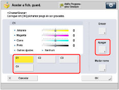 Se selecionar uma tecla que não tenha programações de equilíbrio de cores guardadas, [OK] aparece esbatida e não pode carregar nela. Pode selecionar outra tecla com programações de equilíbrio de cores guardadas ou carregar em [Cancelar].