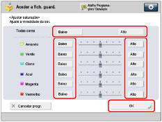 Carregue em [Baixo] ou [Alto] para ajustar o nível de saturação da cor selecionada ou de todas as cores → carregue em [OK].