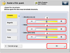 Selecione a cor que pretende ajustar → carregue em [-] ou [+] para ajustar o nível de densidade das áreas mais escuras (alto), médias e mais claras (baixo) → carregue em [OK].