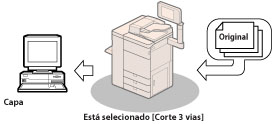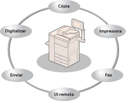 Além das funções de cópia normais, estão à disposição funções novas e práticas que permitem aumentar a produtividade, tais como "Exemplo de cópia" para ajudar a evitar erros de cópia, "Folheto" para fazer cópias em folhetos e "Originais de formatos diferentes" para copiar de uma só vez originais de formatos diferentes.