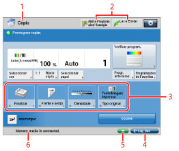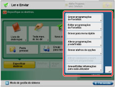 na parte superior direita do ecrã de funções básicas de [Ler e Enviar], ecrã de funções básicas de [Fax], ecrã de envio de [Aceder a ficheiros guardados] e ecrã de envio de [Caixa de fax/I-fax]. |