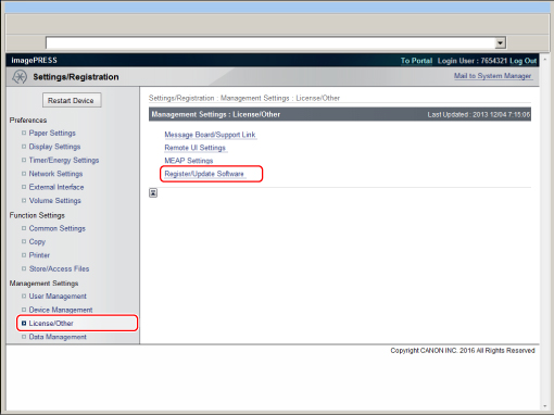 A partir da página do portal da UI remota, clique em [Settings/Registration] → [License/Other] → [Register/Update Software].