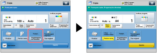 Pode voltar a chamar as programações sem apresentar um ecrã de confirmação a partir do ecrã Funções de cópia básicas.