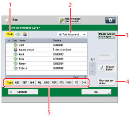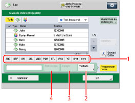Carregue nas teclas alfanuméricas (por exemplo, [ABC]) para ver as teclas individuais de cada letra ou número. Para limitar o intervalo das entradas apresentadas, pode selecionar uma letra ou um número. Carregue em [Tudo] para voltar à lista de endereços completa.