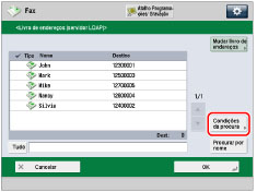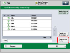 A quantidade de resultados da procura apresentados não excede o limite máximo especificado em [Registar servidor LDAP]. Se o destino pretendido não aparecer, pode aumentar o número máximo de endereços a procurar ou alterar os critérios de procura. (Consulte "Registar um servidor LDAP.")