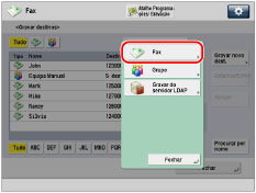 O primeiro caráter que introduzir para o nome é utilizado para ordenar a lista de destinos quando carregar em teclas como, por exemplo, [ABC], [DEF] e [GHI] no ecrã Livro de endereços. Se carregar em [Procurar por nome] no ecrã Livro de endereços, aparece um ecrã que permite restringir a procura no livro de endereços.