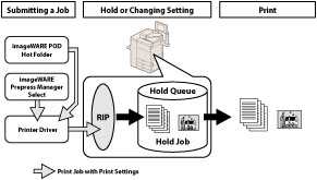 A submitted job is stored in the Hold Queue. Jobs in the Hold Queue have already completed the RIP (Raster Image Processor) process. You can output any job that is stored in the Hold Queue.