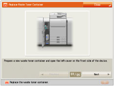 Complete instructions on how to replace the waste toner container can be accessed by pressing [Previous] or [Next] on the touch panel display.