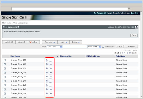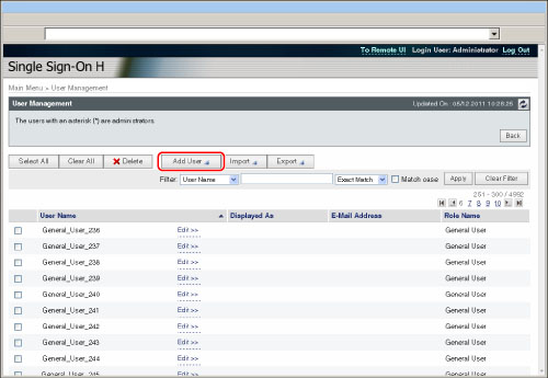 Only the Local Device Authentication administrator can register/edit user data on the [User Management] page. General users can only change their own password.