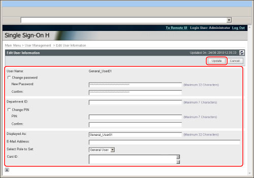If [Department ID Management] is set to 'On', the registered information for Local Device Authentication and the registered user data and PIN in the machine's Department ID Management have to be the same. If the Department ID and PIN have been changed due to the delivery of device information, make sure to change the Local Device Authentication settings accordingly.