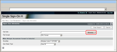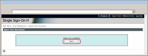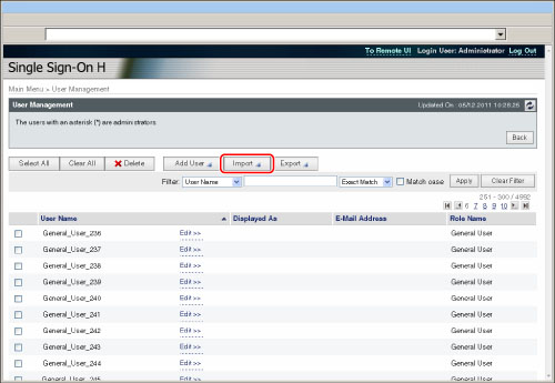 Import the user data created in the file format used for SDL and the Local Device Authentication of SSO-H. (File extension: "ldif")