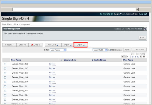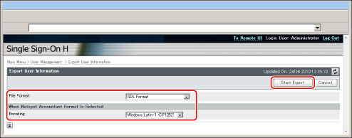 Export the user data in the file format used for SDL and the Local Device Authentication of SSO-H. (File extension: "ldif")