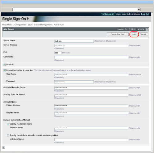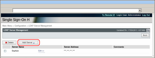 When you click [LDAP Server Management] to display the [LDAP Server Management] screen, the settings in [Configuration] is stored.