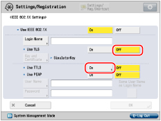 If you set <Use TLS> to 'On', you cannot set <Use TTLS> or <Use PEAP>.