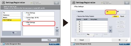 Press [IPSec Settings] for [TCP/IP Settings] → [On] for <Use IPSec>.