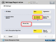 Press [Pre-Shared Key Method] for <Authentication Method> → [Shared Key].