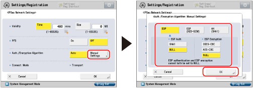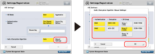 Press [Manual Settings] for <Auth./Encryption Algorithm> → set the algorithm for the authentication method → press [OK].