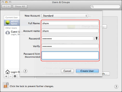 In the [Accounts]/[Users & Groups] window, enter the name of the user to whom you want to send data from the machine through Mac OS X → enter the password.