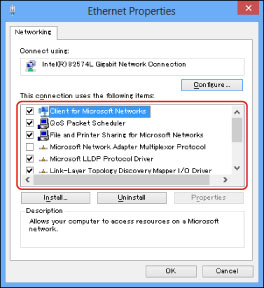 Select [Client for Microsoft Networks], [File and Printer Sharing for Microsoft Networks], and [Internet Protocol (TCP/IP)]/[Internet Protocol Version 4 (TCP/IPv4)].