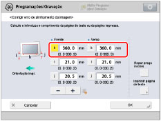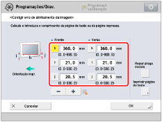 Volte ao ecrã <Corrigir erro de alinhamento da imagem> → introduza o comprimento medido das marcas [I] e [J] para a frente e o verso.