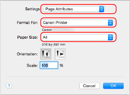 Select [Page Attributes] from [Settings] → select your printer from [Format for] → select a paper size for printing from [Paper Size].