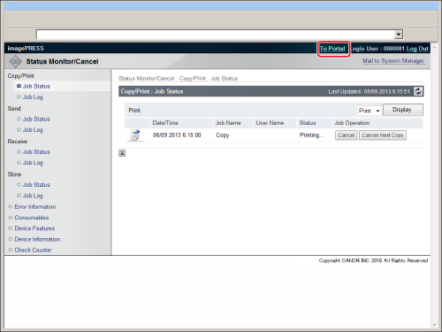To return to the top page, click [To Portal]. This displays information, such as machine status and product name.