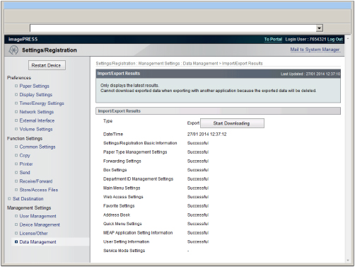 You can also check the latest import/export results by pressing [Data Management] for <Management Settings> → [Import/Export Results].